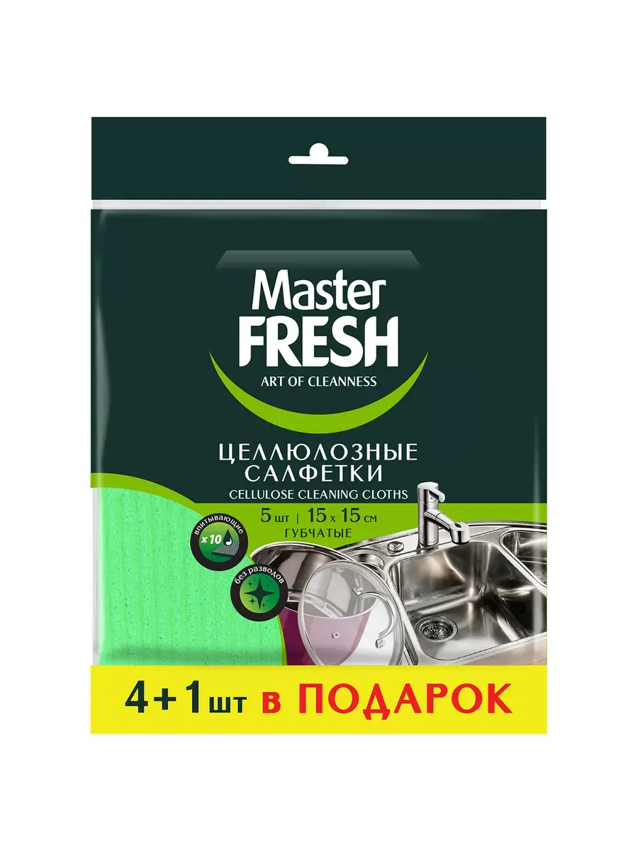 Master Fresh Салфетки для уборки влаговпитывающие целлюлозные, 15*15 см. Инновационные влаговпитывающие салфетки Master FRESH — это эффективное решение для быстрой и качественной уборки. Они изготовлены из 100% целлюлозы и способны впитывать влагу в 10 раз больше собственного веса, удерживая её внутри. Благодаря своей структуре, салфетки быстро и эффективно впитывают жидкость, словно губка, не оставляя разводов на поверхности и вытирая её, как обычная салфетка. Салфетки Master FRESH эффективны даже без использования моющих средств и идеально подходят для уборки пыли. Даже влажная отжатая салфетка не оставляет влаги на поверхности. Во влажном состоянии салфетки мягкие и приятные на ощупь, а при высыхании становятся твёрдыми, что предотвращает развитие микробов и неприятных запахов. Армированная нить в структуре салфеток служит каркасом, который защищает их от повреждений в сухом состоянии. Этот набор хозяйственных салфеток идеально подойдёт для использования в доме, офисе или любом другом помещении, помогая быстро и эффективно убирать разлитые жидкости, пыль и другие загрязнения.