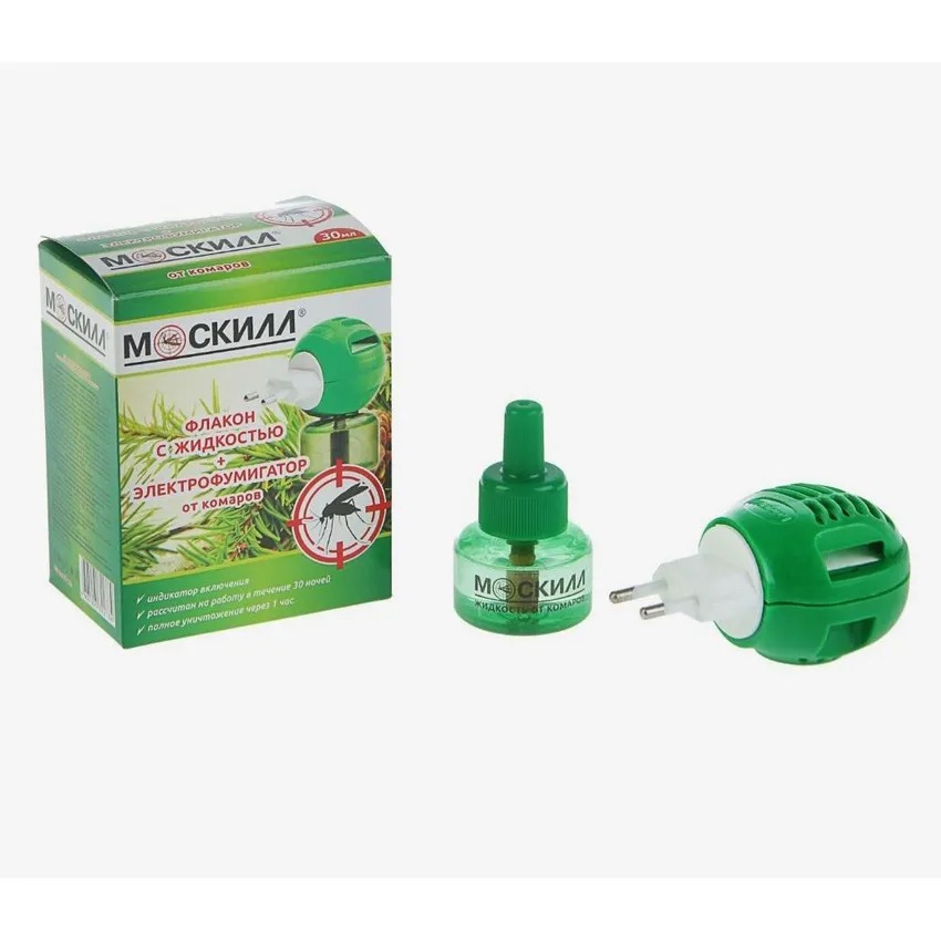Комплект от комаров Москилл Флакон с жидкостью 30 мл и электрофумигатор. Комплект от комаров "Москилл" состоит из электрофумигатора и жидкости от комаров. Без запаха. Безопасно для человека и домашних животных.