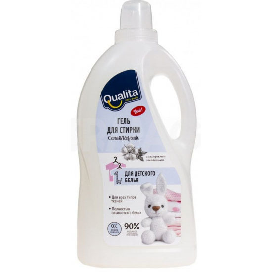 Гель для стирки детского белья Qualita с экстрактом хлопка и льна, отлично подходит для стирки белья для детей разного возраста. Можно использовать для стирки белья детей с самого рождения.