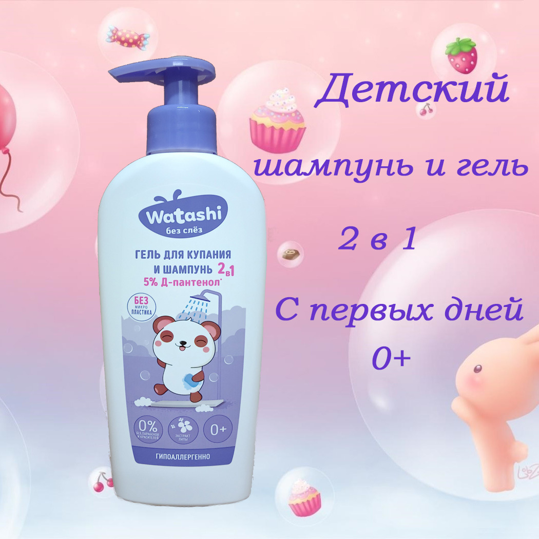 **WATASHI Детский гель для купания и шампунь 2в1** — это универсальное средство, которое бережно очищает нежную кожу и волосы вашего малыша с первых дней жизни.Благодаря формуле «без слёз» купание станет приятным и комфортным процессом для ребёнка. Гель-шампунь содержит только мягкие моющие компоненты, которые не сушат кожу и не вызывают раздражения. Он легко смывается водой, не оставляя ощущения липкости или жирности.В состав средства входят натуральные ингредиенты, такие как экстракты ромашки и алоэ вера. Они оказывают противовоспалительное и успокаивающее действие на кожу малыша, помогая предотвратить появление раздражений и покраснений.Гель-шампунь WATASHI обладает нейтральным pH, который соответствует естественному уровню pH кожи ребёнка. Это позволяет поддерживать естественный баланс кожи и волос, обеспечивая им здоровый вид.Средство подходит для ежедневного использования. Оно экономично расходуется благодаря удобному дозатору и имеет приятный аромат, который понравится вашему малышу.Объём флакона составляет 250 мл, что позволит использовать гель-шампунь в течение длительного времени. Флакон выполнен из прочного пластика, а его дизайн понравится как детям, так и взрослым.**Способ применения:** небольшое количество средства нанести на влажные волосы и тело, лёгкими массирующими движениями вспенить и тщательно смыть тёплой водой. При необходимости повторить процедуру. Подходит для частого применения.Сделайте купание вашего малыша безопасным и приятным с гелем-шампунем WATASHI!